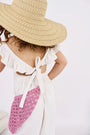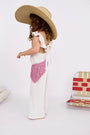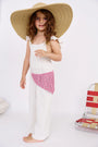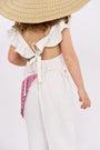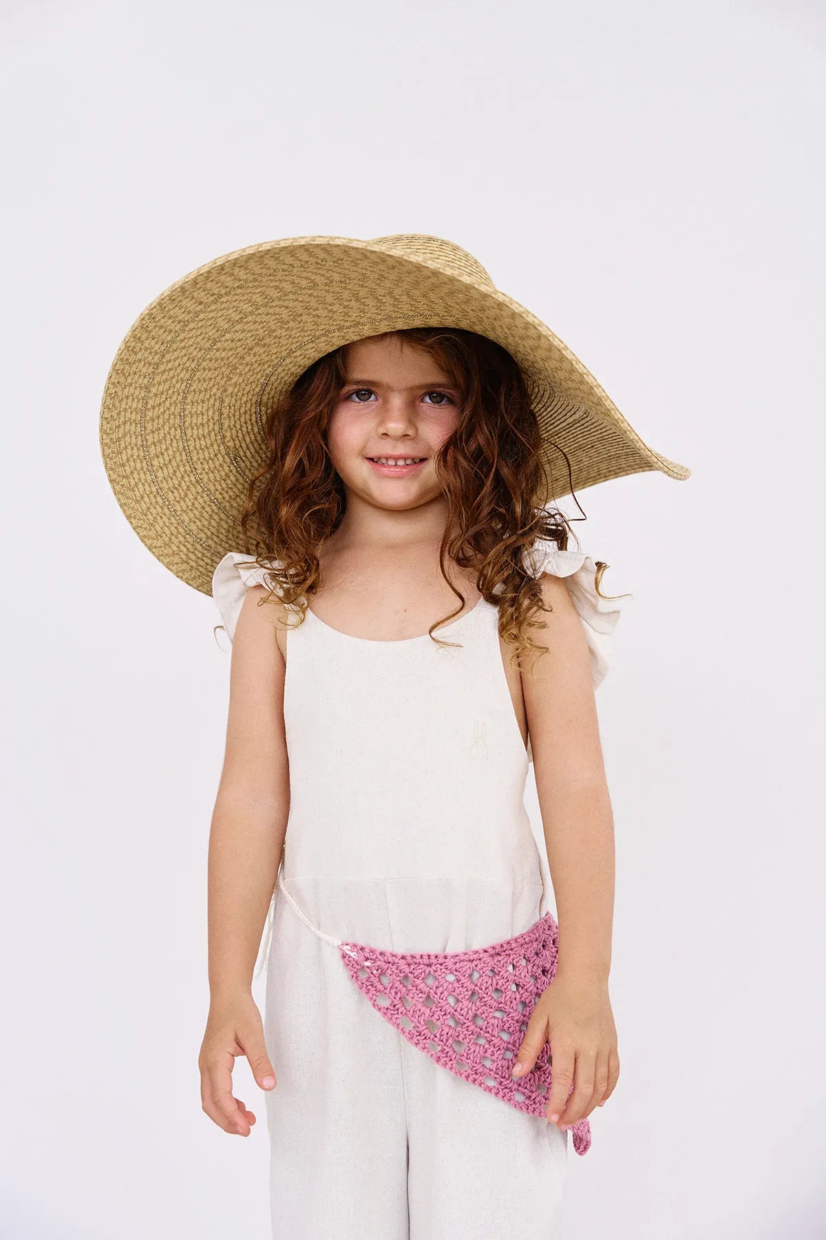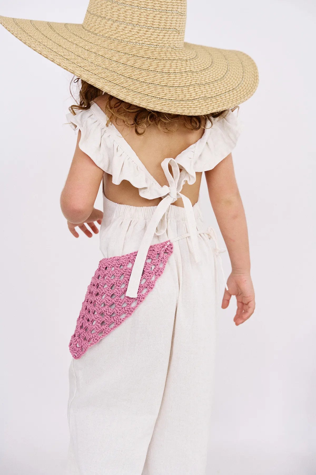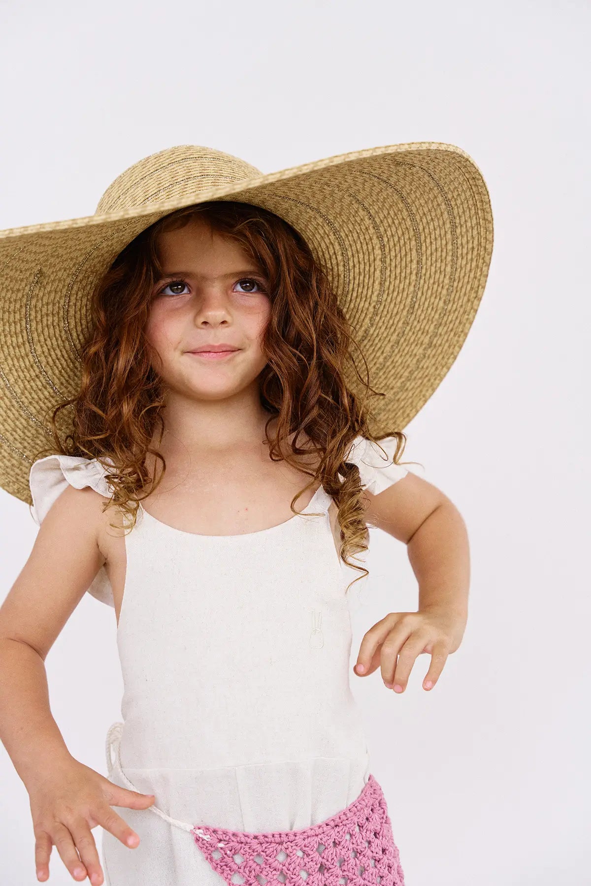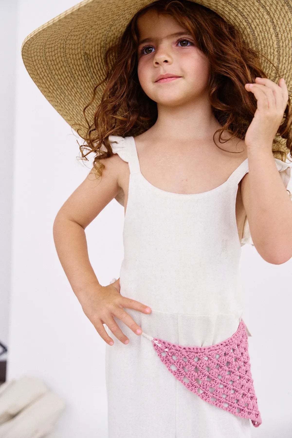 Enterizo para niña en Lino 100%, silueta amplia de tiras, con boleros en las cargaderas.
