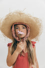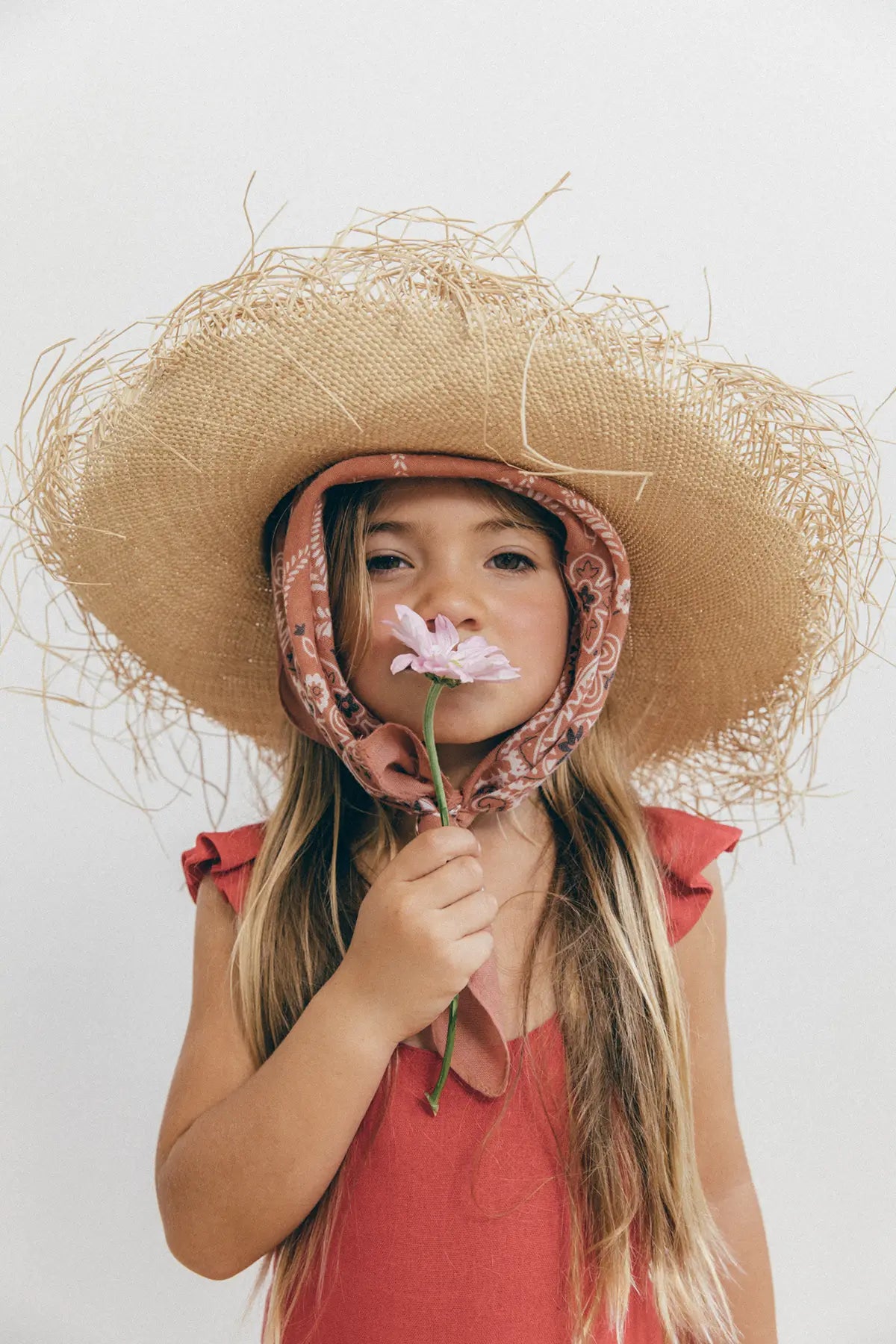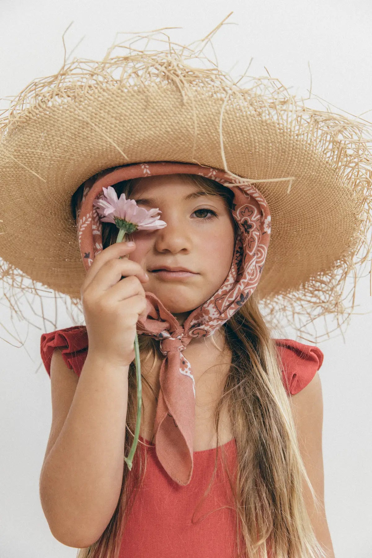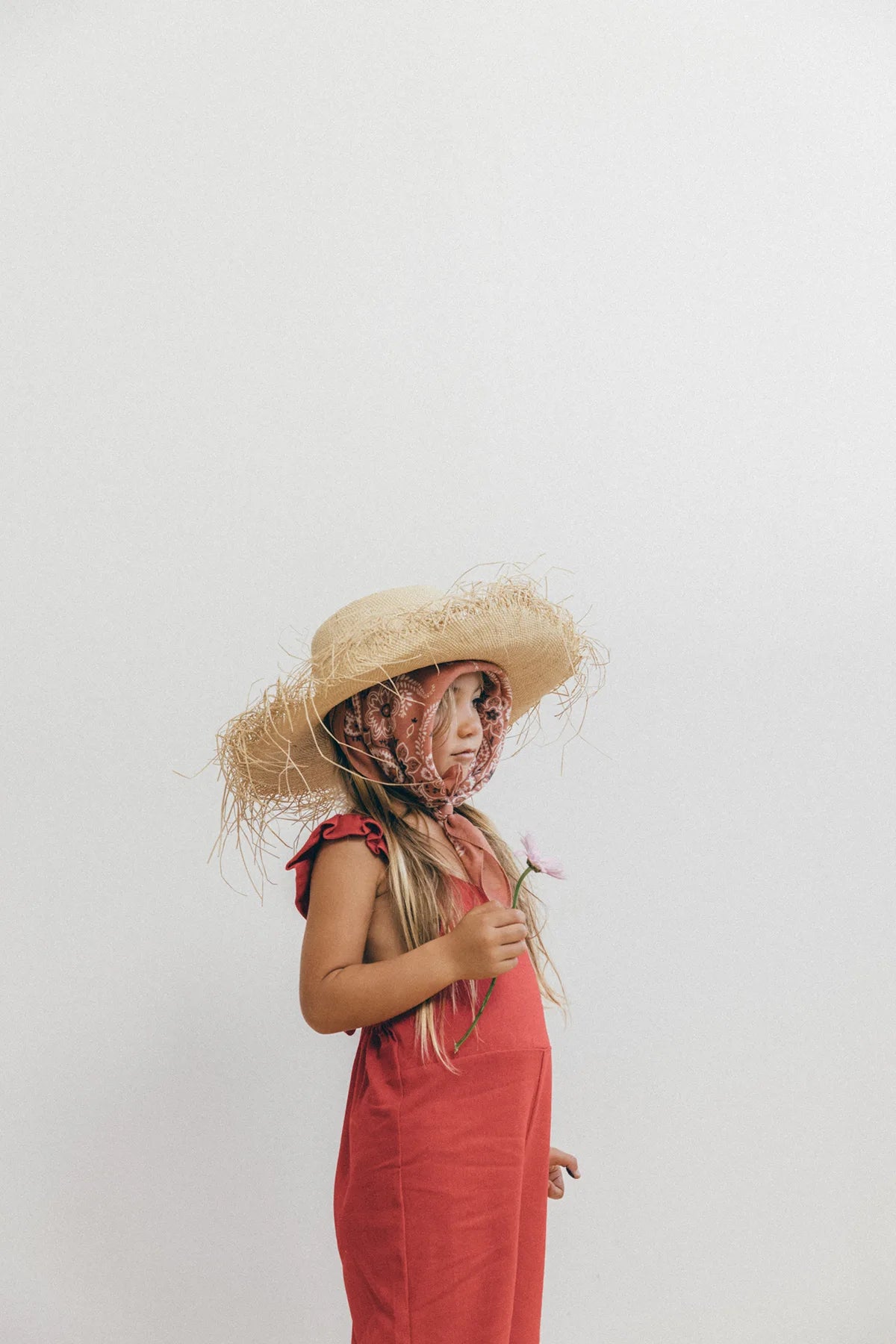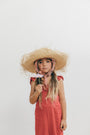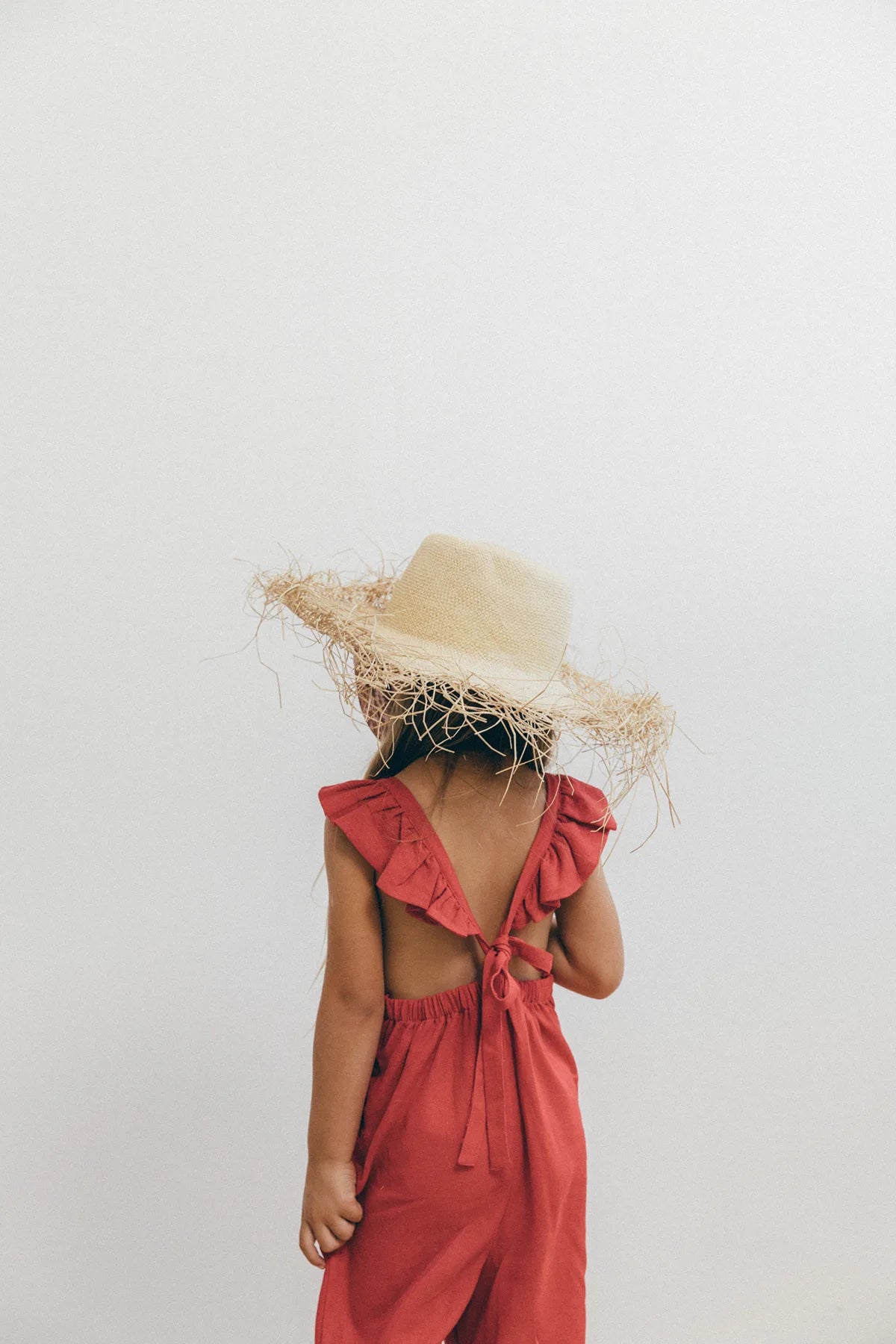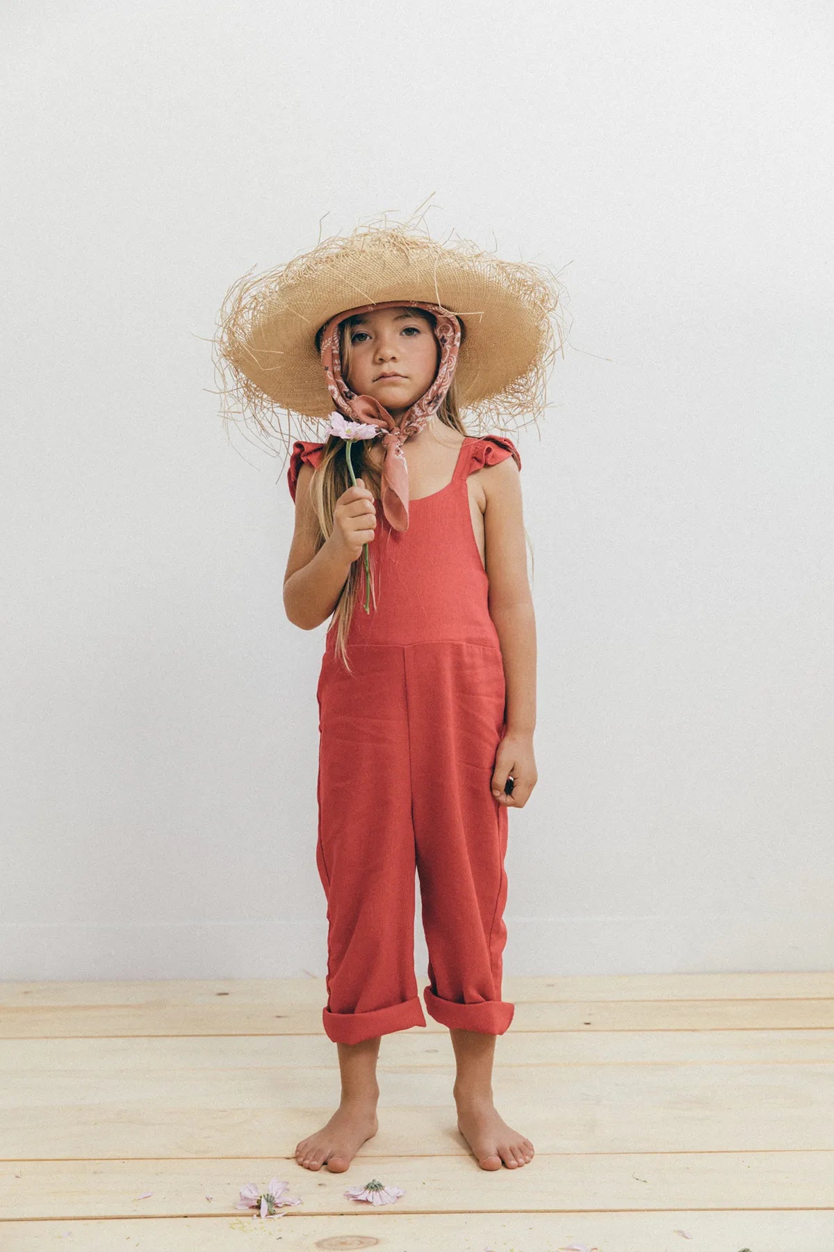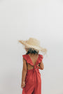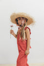 Enterizo Lupe para niña en Lino Rojo 100%, silueta amplia de tiras, con boleros en las cargaderas.