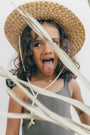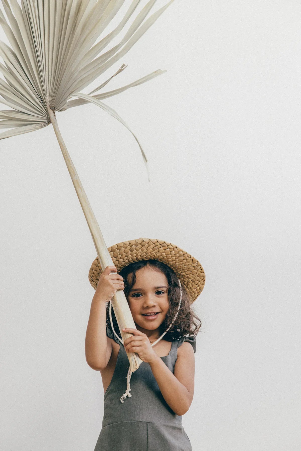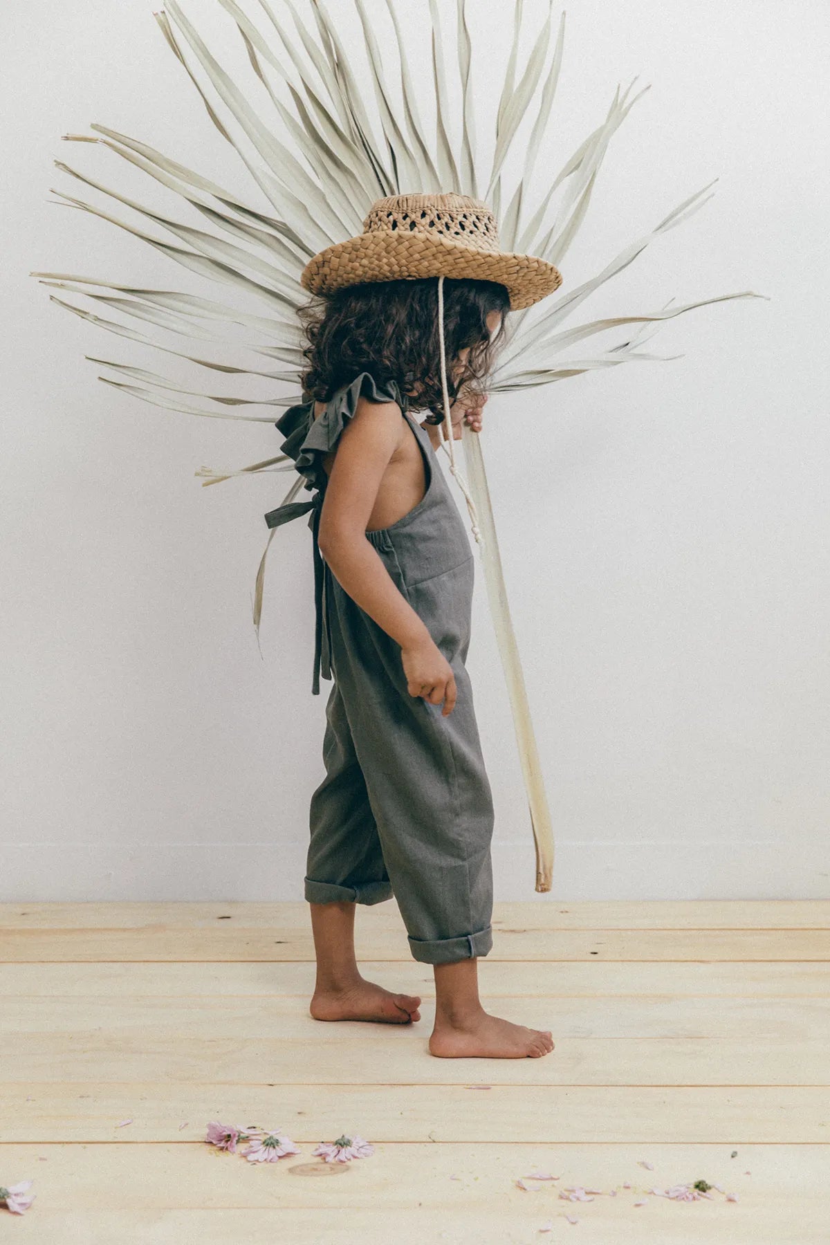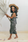 Enterizo para niña en Lino 100%, silueta amplia de tiras, con boleros en las cargaderas.