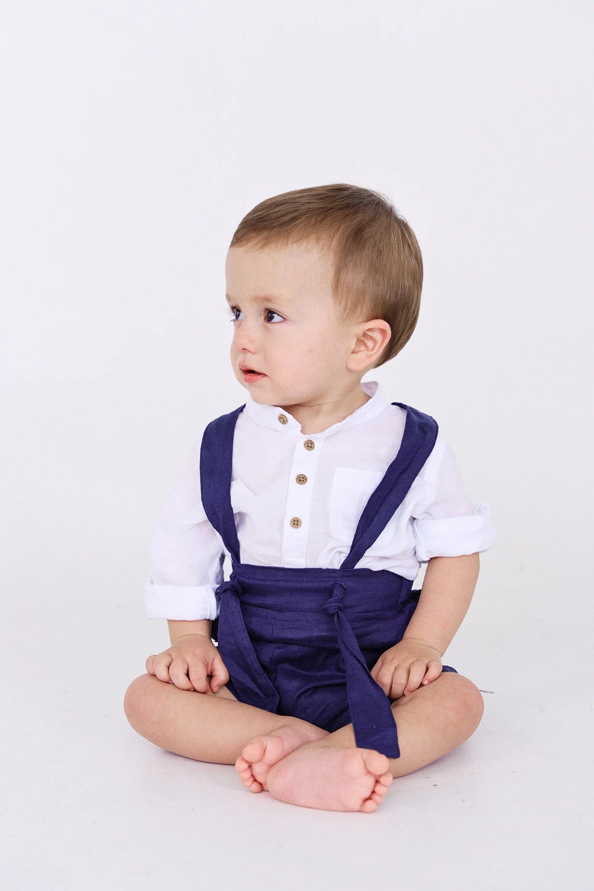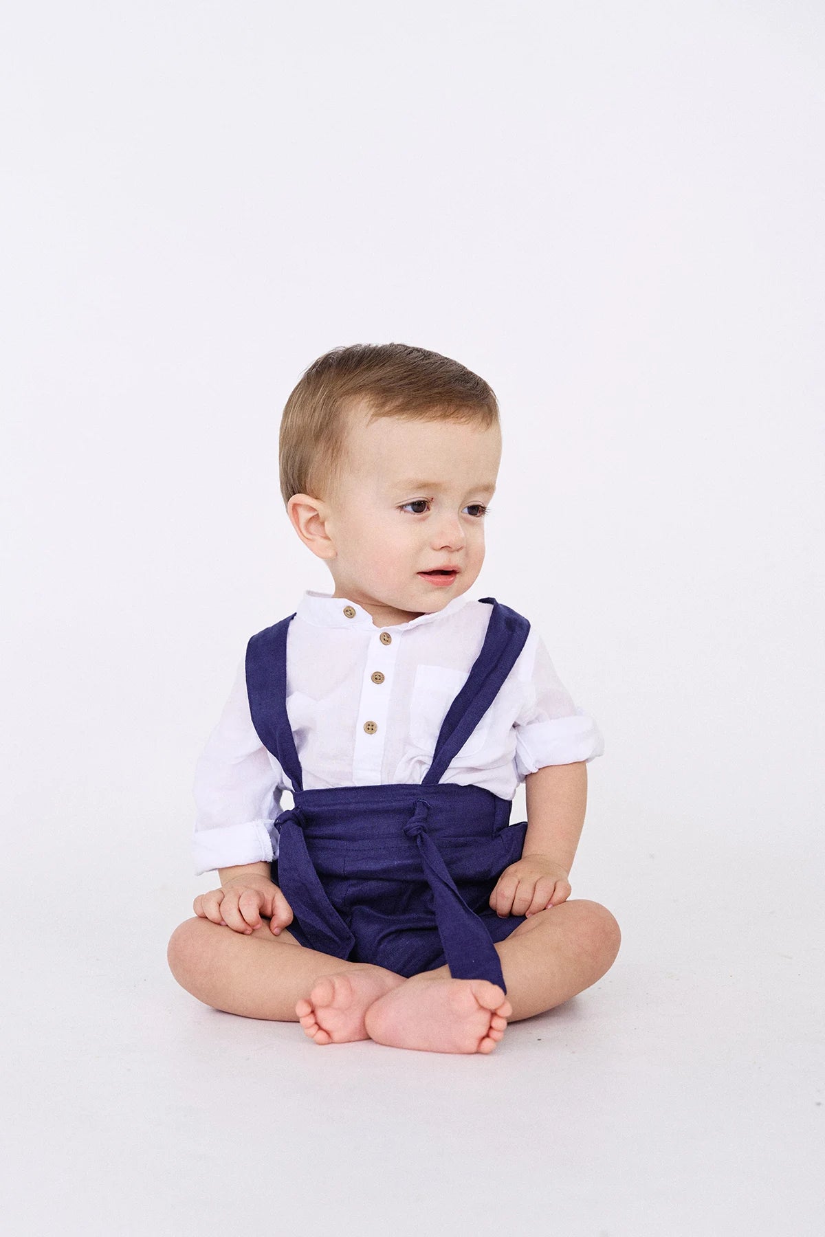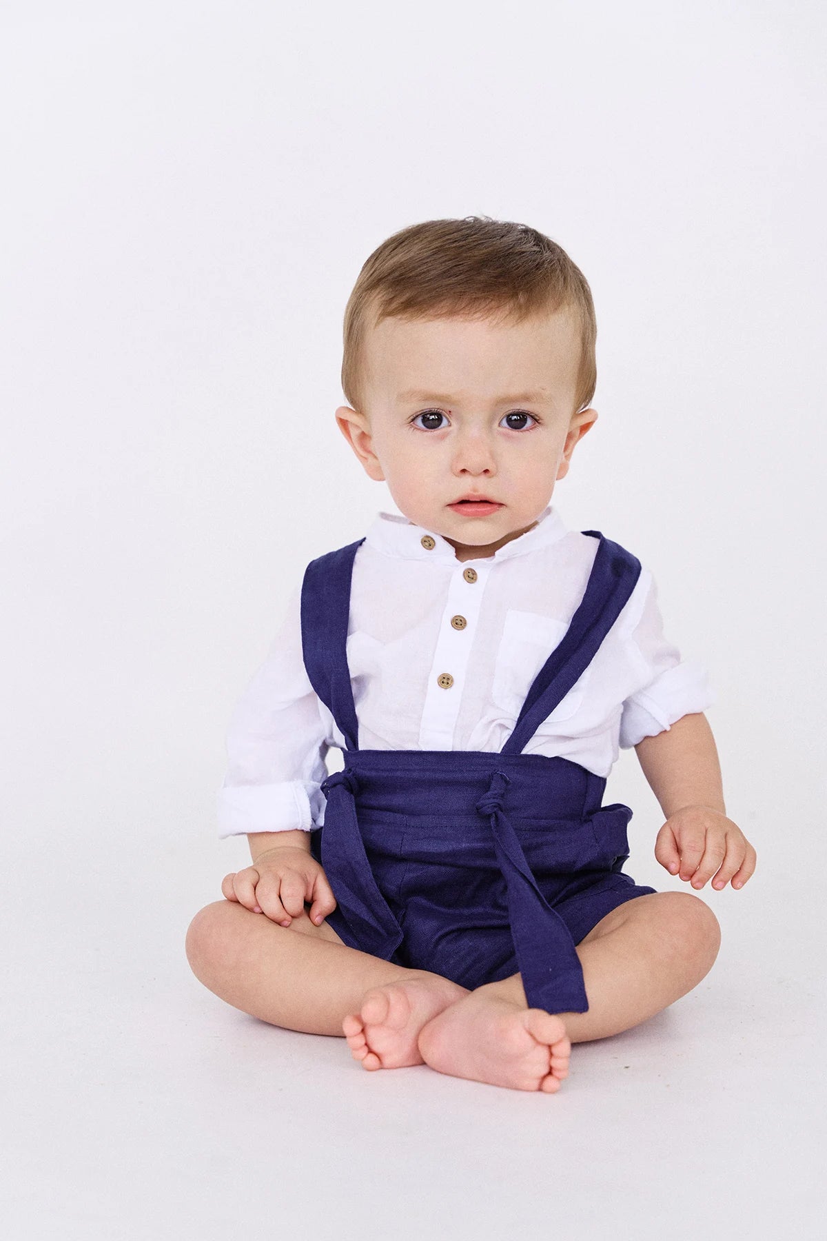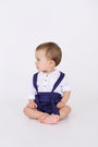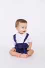 Short Agus para niño de azul oscuro con cargaderas ajustables, elaborado en 100% Lino para mantener cómodos y frescos a nuestros pequeños, el lino es una fibra natural que evita alergias y molestias en la pieles más delicadas.