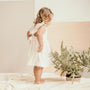 Vestido corto con escote cuadrado y mangas con boleros, perfecto para llenar de comodidad y delicadeza los momentos especiales de las más pequeñas de la casa. Sistema de cierre con botones en la espalda que facilitan el momento de vestir.